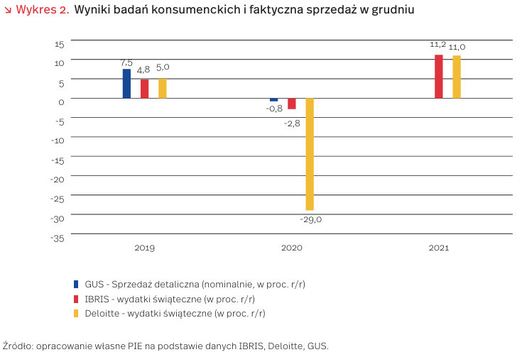 Zupełnie inne tendencje obserwujemy w faktycznych danych GUS. Według badania IBRIS, 32 proc. wydatków świątecznych dokonywana jest w listopadzie. Tym samym, gdyby ankiety poprawnie odzwierciedlały rzeczywistość powinniśmy obserwować umiarkowane wyniki. Faktyczne dane zdecydowanie zaskoczyły – obroty w handlu były wyższe o 21 proc., a realny wolumen o ponad 12 proc.