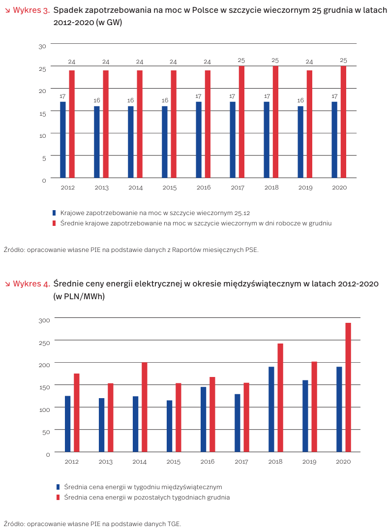 Okres Bożego Narodzenia w Europie oznacza gwałtowny spadek konsumpcji energii elektrycznej. Dla Operatorów Systemów Przesyłowych przy utrzymującym się poziomie wytwarzania może to stanowić wyzwanie w bilansowaniu systemu. W efekcie mogą wystąpić wzrosty napięcia na liniach przesyłowych, podniesienie bezwładności systemu i dynamicznej niestabilności sieci [12]. W latach 2012-2020 średnia wartość zapotrzebowania na moc w szczycie wieczornym 25 grudnia wyniosła 16,5 GW, o ponad 32 proc. mniej niż w dni robocze w grudniu (24,4 GW).