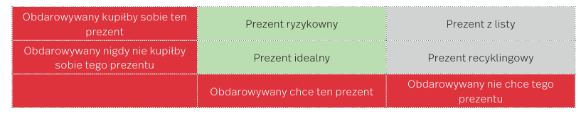 Możemy wyróżnić cztery kategorie prezentów: prezent ryzykowny, prezent idealny, prezent z listy i prezent użyteczny. Prezent ryzykowny to podarunek, który obdarowany chciałby kupić sobie pod pewnymi warunkami, ale nie jest go pewien. Jego wręczenie może być strzałem w dziesiątkę, ale może prowadzić też do rozczarowania. Prezent idealny to taki, którego obdarowany nigdy by sobie nie kupił, ale bardzo chciałby go mieć. Nie kupi go jednak, bo czułby się winny wydając na niego, nierzadko dużo pieniędzy (np. zestaw głośników, najnowszy czytnik ebooków, bilety na koncert). Prezent z listy to prezent użyteczny (każdy potrzebuje skarpet i pidżamy, czyż nie?). To ten rodzaj prezentu, który nie jest prezentem. Z kolei, jeśli dostaliśmy coś czego nie chcieliśmy, a wydaje nam się, że ktoś inny zrobi z tego użytek, to daje my ten prezent raz jeszcze. Tym właśnie jest podarunek recyklingowy, w przypadku którego zakładamy, że druga osoba na pewno bardziej ucieszy się z prezentu, który dla nas jest bezwartościowy [18].