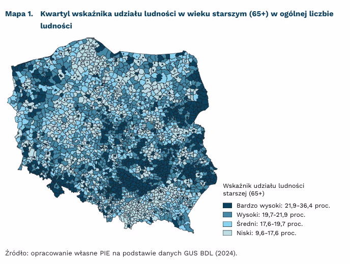 Proces starzenia się ludności w Polsce jest silnie przestrzennie zróżnicowany i nie przebiega jednakowo we wszystkich gminach. W skali kraju w 2024 r. osoby w wieku 65+ stanowiły 20,6 proc. ludności, a według prognozy GUS, w 2060 r. ich udział wzrośnie do 32,6 proc. Konsekwencje tego procesu ujawniają się jednak przede wszystkim lokalnie. Starzenie postępuje nierównomiernie i koncentruje się w gminach dotkniętych depopulacją oraz w mniejszym stopniu obejmuje obszary suburbanizujące się wokół dużych ośrodków miejskich. W efekcie starość demograficzna staje się zjawiskiem spolaryzowanym przestrzennie, którego dynamika i skutki różnią się zasadniczo między regionami.