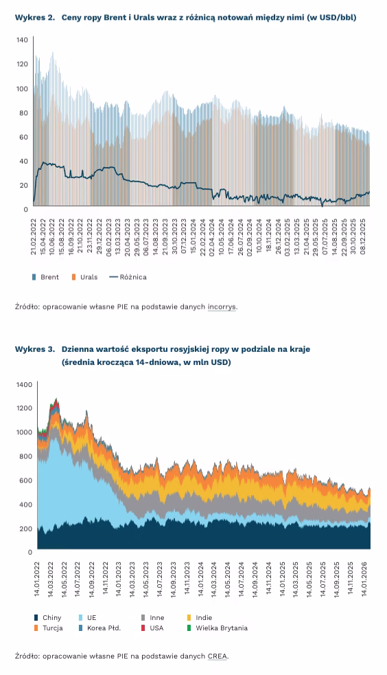 Spadek eksportu do krajów UE został częściowo nadrobiony przez wzrost eksportu do Chin i Indii. O ile jednak eksport do Chin pozostaje na względnie stabilnym poziomie od połowy 2022 r. (dzienna wartość importu ropy wynosi 200 mln USD), to w ostatnich miesiącach blisko dwukrotnie spadła wartość importu Indii (ze 100-120 mln USD dziennie w 2025 r. do ok 60-70 mln USD w styczniu i lutym 2026 r.). Spadek importu Indii jest efektem presji USA. Indyjski import rosyjskiej ropy może nadal spadać na skutek zapowiadanej umowy między Indiami a USA, które ma zakładać zwiększenie importu amerykańskiego surowca.