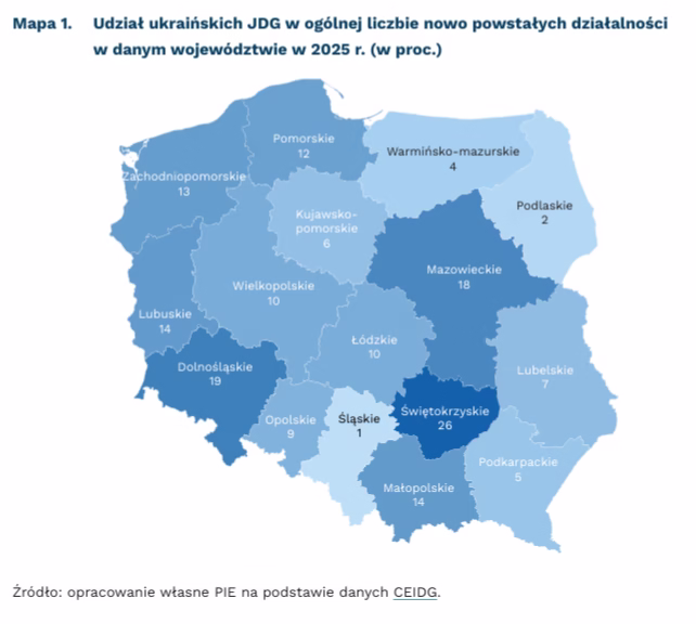 W 2025 r. działalność rozpoczęło 31,4 tys. jednoosobowych działalności gospodarczych (JDG) prowadzonych przez obywateli Ukrainy – wynika z danych Centralnej Ewidencji i Informacji o Działalności Gospodarczej (CEIDG). Firmy te stanowiły 12 proc. wszystkich założonych JDG w Polsce. Ponad połowa nowych działalności została zarejestrowana w województwach: mazowieckim, dolnośląskim oraz małopolskim (odpowiednio: 28 proc., 14 proc. oraz 12 proc.). W tych regionach polscy przedsiębiorcy założyli łącznie 35 proc. wszystkich JDG powstałych w 2025 r. Najwyższy odsetek ukraińskich JDG w ogólnej liczbie nowo powstałych działalności w poszczególnych regionach odnotowano w województwach: świętokrzyskim (26 proc.), dolnośląskim (19 proc.) oraz mazowieckim (18 proc.). Najniższy udział wystąpił w województwach śląskim (1 proc.) oraz podlaskim (2 proc.).
