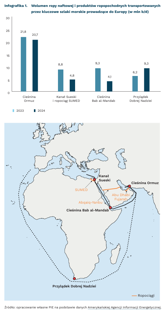 Mniej istotne dla światowego handlu, ale o szczególnym znaczeniu z perspektywy importu do Europy są Cieśnina Bab al-Mandab i Kanał Sueski. Znacznie mniej światowego morskiego handlu ropą odbywało się przez Morze Czerwone. Wolumen ropy transportowany przez Cieśninę Bab al-Mandab spadł z 9,3 mln baryłek w 2023 r. do 4,1 mln w 2024 r. (z 11 do 6 proc. światowego morskiego handlu ropą). Nieco mniejszy spadek zanotowano w Kanale Sueskim i w ropociągu SUMED łączącym Morze Czerwone z Morzem Śródziemnym: z 8,8 mln w 2023 r. do 4,8 mln baryłek w 2024 r. W tym czasie o połowę wzrósł wolumen ropy przewożonej alternatywną trasą dookoła Afryki (z 6,2 mln do 9,3 mln baryłek).