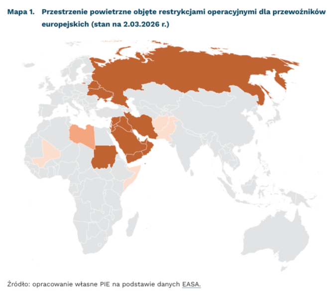 Trwająca eskalacja napięć i działań zbrojnych na Bliskim Wschodzie spowodowała zaburzenia w cywilnym ruchu lotniczym. Ograniczenia wynikające z ostrzeżeń dotyczących zagrożeń bezpieczeństwa w przestrzeni powietrznej w regionie Zatoki Perskiej, będącej głównym hubem przesiadkowym w ruchu z Europy do krajów Azji, prowadzą do modyfikacji tras i wydłużenia rejsów. Istotne znaczenie ma sytuacja portu lotniczego w Dubaju w Zjednoczonych Emiratach Arabskich. W 2025 r. był to drugi największy port pod względem liczby obsłużonych pasażerów na świecie – 95 mln (z czego prawie połowę stanowili pasażerowie przesiadający się). Innym kluczowym portem lotniczym w regionie jest Doha, w którym w 2025 r. obsłużono ponad 54 mln pasażerów, z czego 75 proc. w ruchu tranzytowym (dla porównania, Lotnisko Chopina w Warszawie obsłużyło w zeszłym roku rekordowe nieco ponad 24 mln pasażerów). Nawet po ustaniu działań zbrojnych, powrót do normalności operacyjnej będzie procesem rozłożonym w czasie, a przywrócenie pełnej siatki połączeń może potrwać wiele miesięcy – także z powodu spadku zaufania pasażerów do tej trasy.