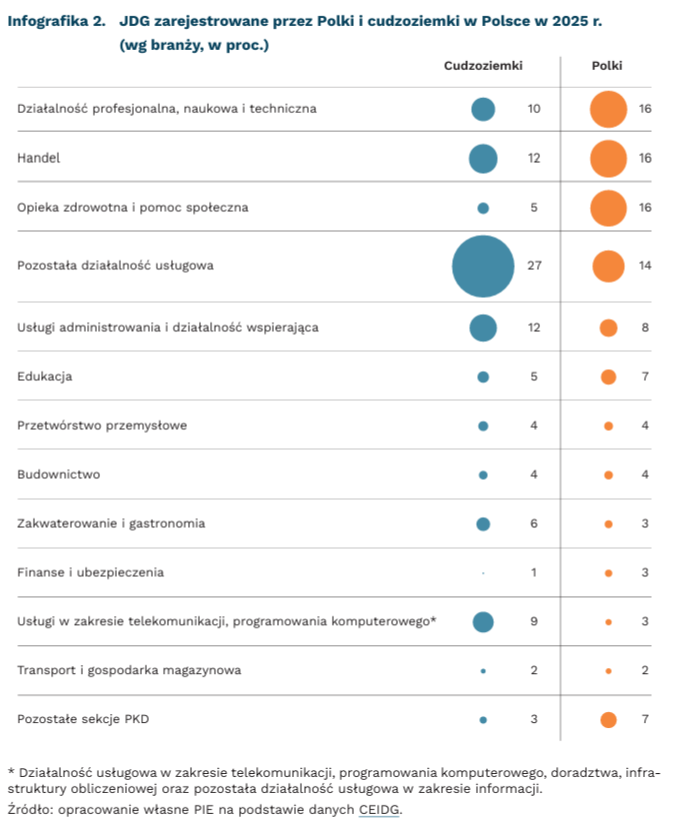 6 na 10 nowych JDG założonych przez Polki koncentruje się w działalności profesjonalnej, naukowej i technicznej, handlu, opiece zdrowotnej i pomocy społecznej oraz pozostałej działalności usługowej. W strukturze branżowej działalności Polek udział opieki zdrowotnej i pomocy społecznej wynosi 16 proc., podczas gdy w przypadku cudzoziemek tylko 5 proc. Podobna sytuacja występuje w działalności profesjonalnej, naukowej i technicznej, w finansach i ubezpieczeniach, a także w handlu. Część branż ma zbliżony lub taki sam udział w strukturze zakładanych działalności, zarówno wśród Polek, jak i cudzoziemek (np. przetwórstwo przemysłowe, budownictwo).