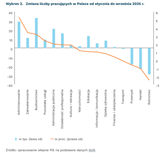 Dane wskazują również na istotne zmiany zachodzące w strukturze zatrudnienia i pojawiającym się niedopasowaniu popytu do podaży na rynku pracy. Od stycznia do września 2025 r. najwyższe spadki zatrudnienia zanotowano w rolnictwie, handlu oraz produkcji przemysłowej. W handlu liczba pracujących spadła o 23 tys. osób (-1 proc.), w produkcji przemysłowej o 17 tys. (-0,5 proc.), zaś w rolnictwie o 29 tys. (-2,5 proc.). Spadek zatrudnienia w rolnictwie może być tłumaczony ułatwieniami w rejestracji rolników jako osób bezrobotnych[2]. Dane dotyczące zatrudnienia w produkcji przemysłowej i handlu wskazują jednak, że polska gospodarka traci miejsca pracy w sektorach, które tradycyjnie wchłaniały największą liczbę pracowników o średnich i niskich kwalifikacjach. Równocześnie jednak w części branż odnotowano wzrost zatrudnienia, z czego najwyższy dotyczył budownictwa (+33 tys., o 3,2 proc.), administrowania i działalności wspierającej (+29 tys., o 5,3 proc.), administracji publicznej (+21 tys., o 2 proc.), działalności profesjonalnej i naukowej (+16 tys., o 1,9 proc.) edukacji (+13 tys., o 1 proc.).