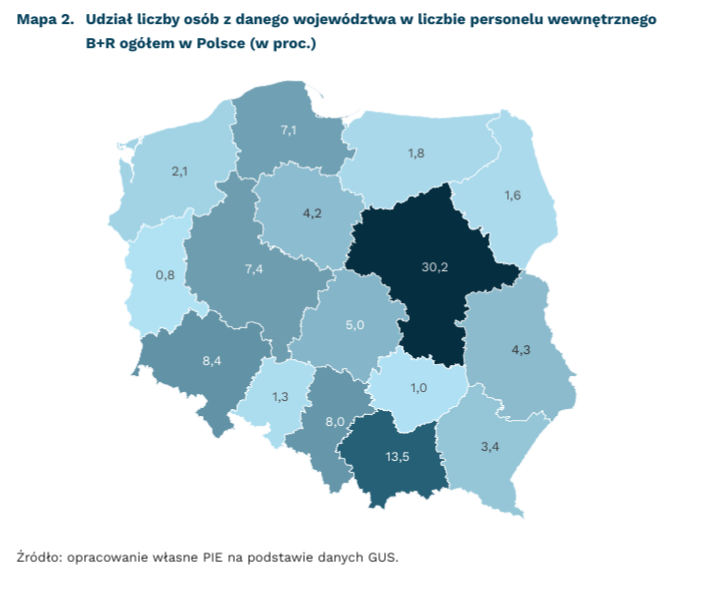30 proc. całego personelu wewnętrznego B+R w Polsce pracuje w województwie mazowieckim. Następne w kolejności są województwa: małopolskie (14 proc.), dolnośląskie (8 proc.) i śląskie (8 proc.). Na drugim krańcu są województwa lubuskie, świętokrzyskie i opolskie, w których pracowało po ok. 1 proc. zaklasyfikowanych jako personel B+R. Taki rozkład obrazuje dominację kilku metropolii, w których koncentruje się działalność innowacyjna oraz znikomy udział w takiej działalności regionów znajdujących się na drugim krańcu spektrum.