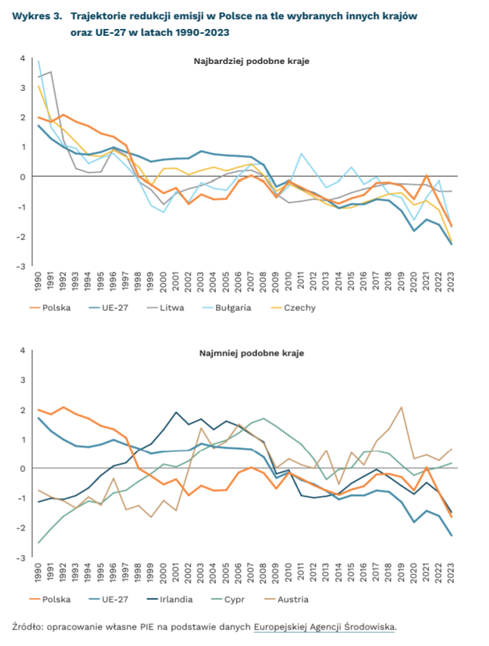 Pomimo wyższej energochłonności polskiej gospodarki, przeprowadzone obliczenia wskazują, że Polska jest opóźniona względem ogólnego spadku tempa redukcji emisji w UE-27 niespełna o rok. Kształt unijnej trajektorii redukcji emisji jest dość podobny do polskiego, różni się jednak konsekwentnym spadkiem emisji, który rozpoczął się w okolicach 2005 r. Datę tą można powiązać z wejściem w życie systemu handlu emisjami EU ETS.